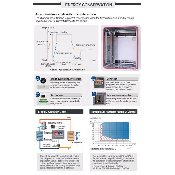 Sample is placed in the test chamber, more extreme temperature than test temperature can be set in high-temperature chamber and low-temperature chamber. When it comes to low temperature test, cold chamber door open, and low-temperature chamber working together with test chamber.